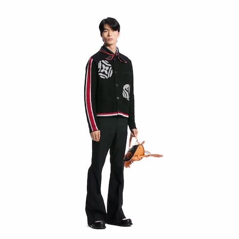 2025秋冬ファッションショーに登場した、ブラックのコットンニットジャケット。袖やウエストに施されたグラフィカルなレッド&ホワイトのラインが、プレッピーな雰囲気を演出します。質感豊かな軽量のニットをエレガントなノーカラーのシルエットに仕立て、大胆なホワイトのインターシャでメゾンのシグネチャーをあしらった、オーバーサイズのLV ポルカドット モチーフが際立ちます。カーディガンや夏のアウターレイヤーとしても着用できる万能な1着。