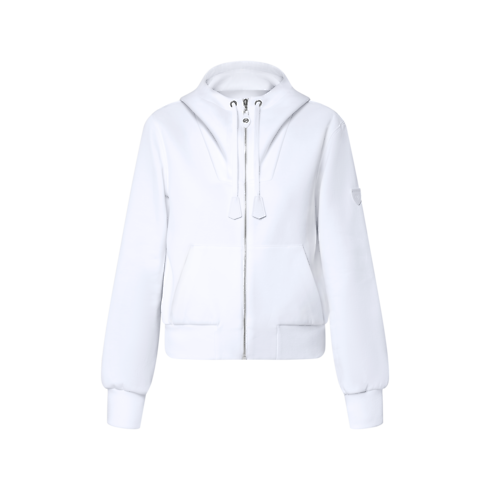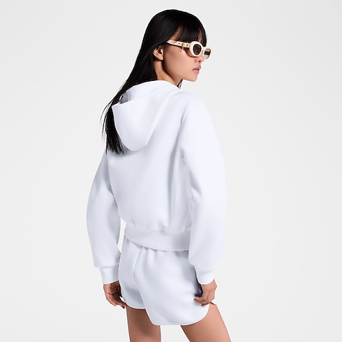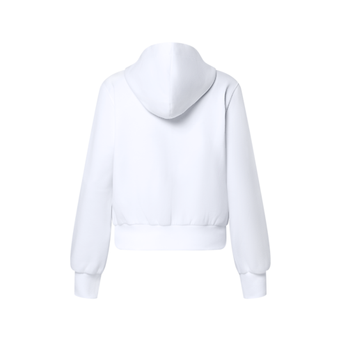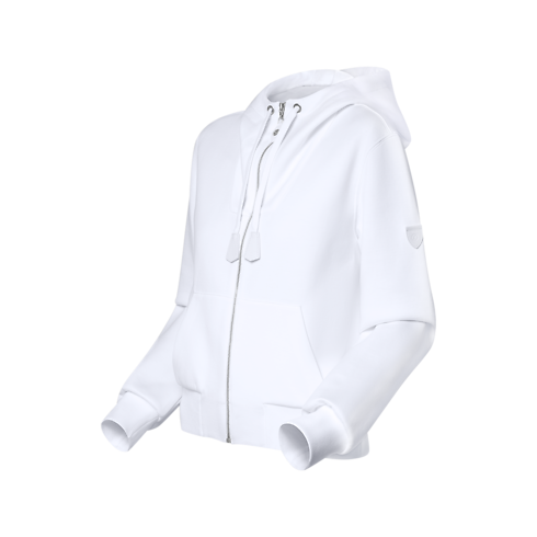 シャープなモノトーンでアップデートされた、毎日の装いを引き立てるカジュアルなジップアップフーディ。柔らかなコットンジャージーで仕立て、存在感のあるリブ編みのヘムを配しました。ドローストリングにはレザーのチップを、左袖には同系色で仕上げたLV サークルのレザーパッチを控えめに添えています。実用的な2つのポケット付き。
