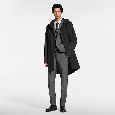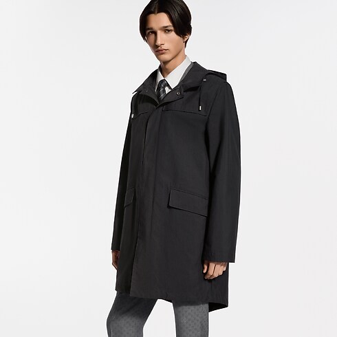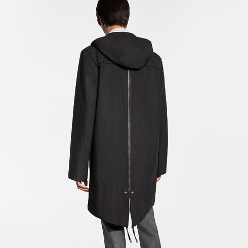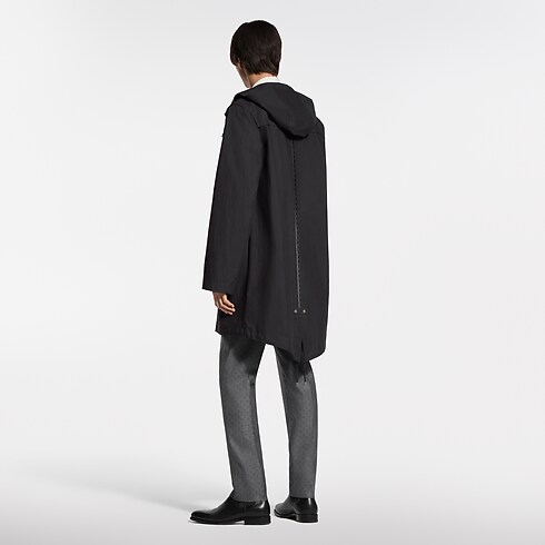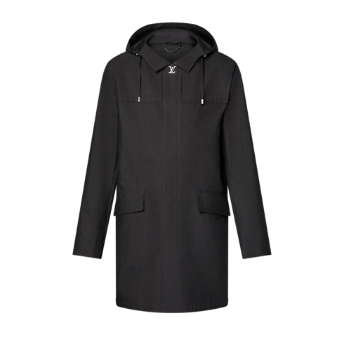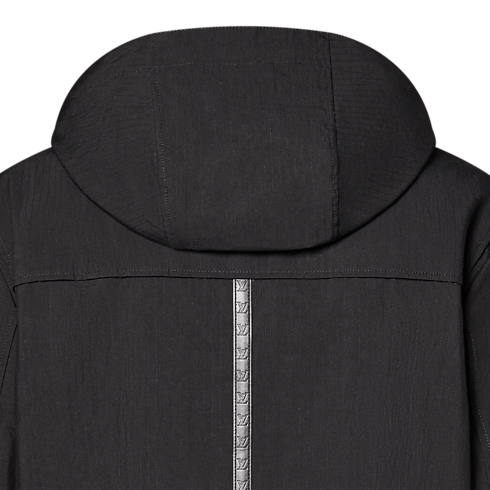 耐水性のあるブラックのフード付きパーカ。コットンのテクニカルリップストップで仕立てた、エレガントで機能的かつ軽やかなアウターレイヤーです。ファスナープラケット上部のLV スナップボタンやモノグラム・フラワーのアイレットとリベットなど、洗練されたディテールをミニマルなシルエットにあしらいました。背面にもメゾンの旅の伝統にオマージュを捧げる、エンボス加工を施したLV ロジンのレザーテープを配しています。ビジネスから週末の装いまで幅広く活躍する万能な1着。