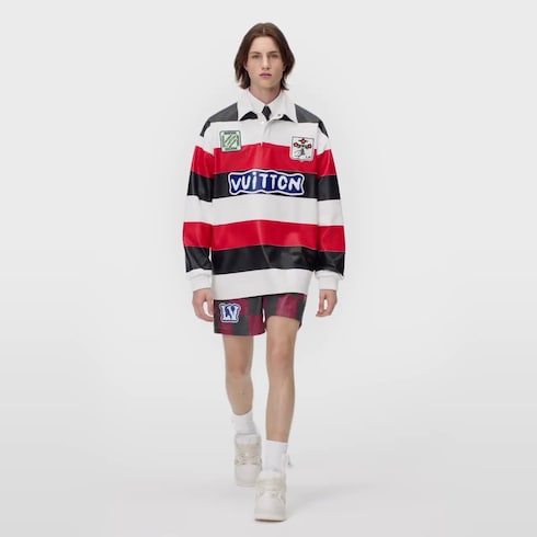2024春夏ファッションショーに登場した目を引くレザーのラグビーシャツ。メンズ・ウェアのコードを再解釈し、スポーツウェアの世界にラグジュアリーなサヴォアフェール(匠の技)を融合しました。バターのように柔らかなラムレザーをオーバーサイズのフィット感に仕上げ、インターシャ(象嵌細工)の技法で表現した大胆な横縞に添えた、メゾンのシグネチャーの刺繍入りワッペンが特徴です。レザーショーツと合わせれば洗練されたスタイルを演出する、グラフィカルなアイテムです。