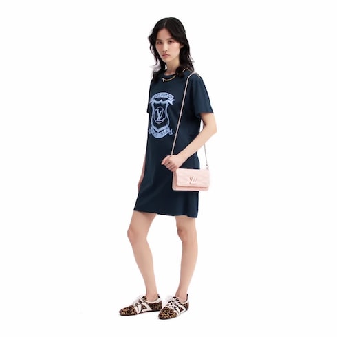 カジュアルなストレートカットのシェイプにエレガントなモックネックを配した、モダンでプレッピーな雰囲気のTシャツドレス。柔らかなコットンジャージーで仕立て、胸元には大ぶりなLV クレストのエンブレムを、左肩にはゴールドカラーのファスナー & チェーンのディテールをあしらっています。