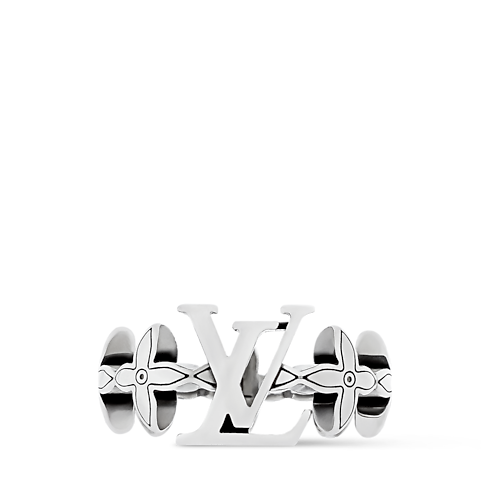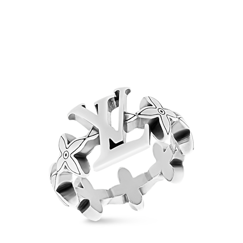 アイコニックなモノグラムを彫刻的に再解釈した「パフィチェーンリング・LV フラワー 」。フラワー・モチーフの表面や中央のLV イニシャルは、緩やかな丸みを帯びたフォルムで表現し、ブラックエナメルで繊細に縁どられています。異なる素材とシェイプが融合し、メゾンのイコノグラフィーを大胆に讃えます。