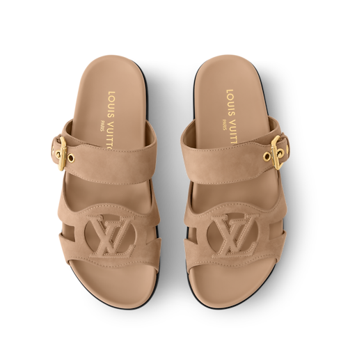 ベルベットのようなスエードベビーゴートレザーを使用した「LV イソラ ミュール」。パッド入りのアナトミックフットベッドを備えたリラックス感のあるスタイルで、「LV イソラ」ラインのコードを受け継ぐ、特徴的なLV サークル・モチーフのカットアウトがフロントストラップにあしらわれています。もう1本の調節可能なストラップには、大きめのゴールドカラーのバックルとアイレット付き。