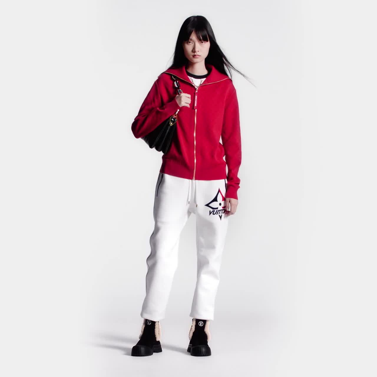 柔らかいコットンインターロックジャージーを使用した、フレッシュ & スポーティなジョギングパンツ。コントラストを描くリブ編みの足首のカフとファスナー付きのサイドポケットが、グラフィカルな雰囲気を演出します。アウターシームには、フランスのトリコロールを想わせるレッドとブルーのトップステッチをさりげなく施し、左の腰には今シーズンならではのオーバーサイズの「Vuitton スノーフレーク」シグネチャーのプリントをあしらいました。