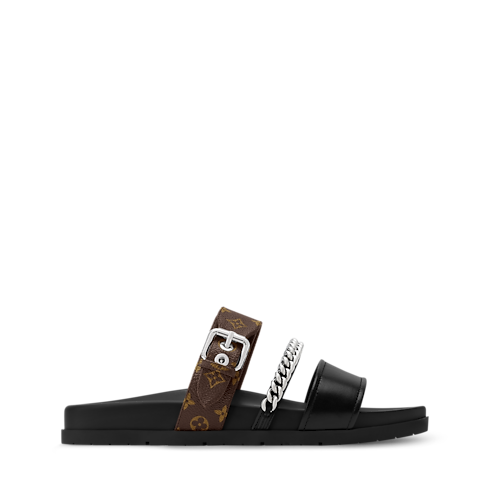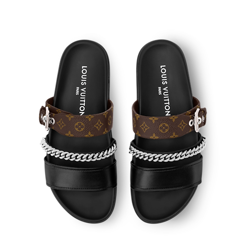 しなやかなラムレザーにモノグラム・キャンバスを組み合わせた、リラックス感のある雰囲気の中にも洗練さが薫る「LV バイブ ミュール」。3本の異なるストラップが特徴で、中央のストラップにはシルバーカラーのボリューム感のある装飾チェーンがあしらわれています。快適なアナトミックフットベッドと軽量ラバーアウトソールを備えた1足。