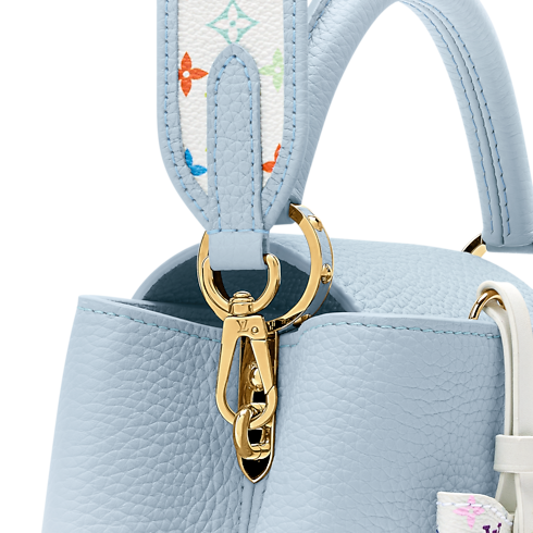ルイ・ヴィトンのモノグラム・キャンバス誕生130周年を讃える「モノグラム・アニバーサリー」コレクションのためにアップデートされた、エレガントな「LV × TM カプシーヌ BB」。「ルイ・ヴィトン × 村上隆」リエディション・コレクションの一部として登場したこの遊び心溢れるアイテムに、ブルーオランプのトリヨンレザーにリボン形のキーベルをはじめとしたマルチカラーのモノグラムのトリミングでアクセントを添えました。シグネチャーのゴールドカラーのパドロック(錠前)で洗練された印象に。