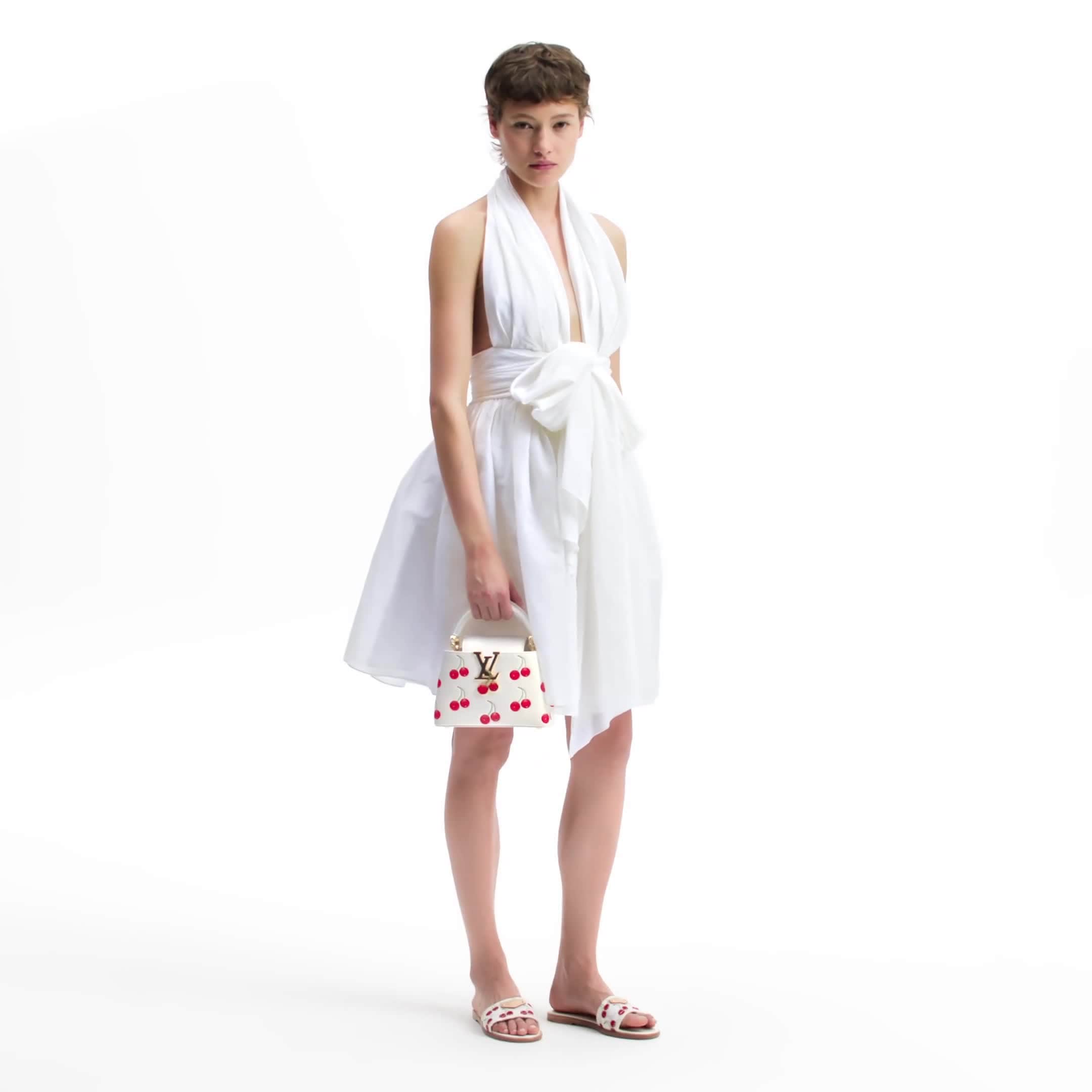 多彩なカテゴリーで展開する「ルイ・ヴィトン × 村上隆」リエディション・コレクションならではのいきいきとしたステートメントを放つ、メゾンのアイコニックな「LV × TM カプシーヌ MINI」。前面のエンブレマティックなLV イニシャルをはじめとする光沢感のあるゴールドカラーの金具をレザーにあしらい、シックな夏らしいルックに仕上げました。この日本人アーティストを象徴する陽気なスタイルで描いたカラフルなチェリー・モチーフを、デボス加工で遊び心たっぷりに施しています。