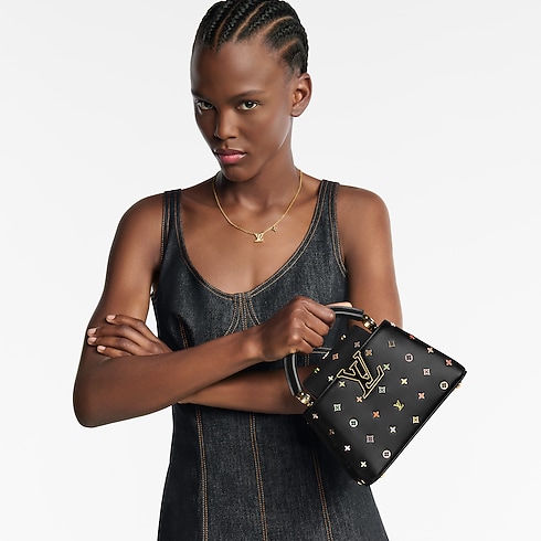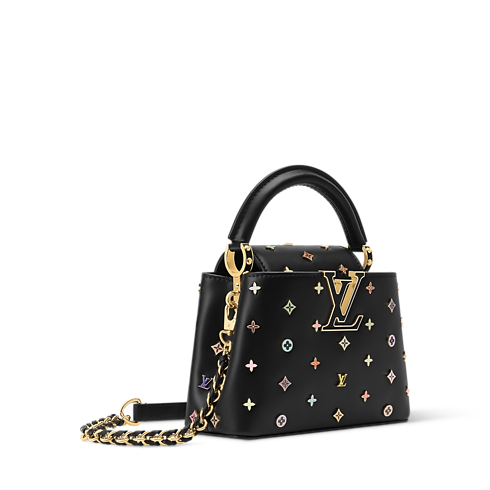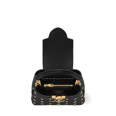 「ルイ・ヴィトン × 村上隆」リエディション・コレクションの一部として登場し、ルイ・ヴィトンのモノグラム・キャンバス誕生130周年を讃えてデザインされた「LV × TM カプシーヌ MINI」。レザーにマルチカラーのモノグラム・フラワーのスタッズとLV イニシャルをあしらい、クチュール風の仕上がりを演出しました。フラップはバッグの中に入れることも外に出すこともでき、2通りの装いを楽しめるデザイン。多彩な持ち方が可能で、イブニングシーンにふさわしいエレガントなアイテムです。