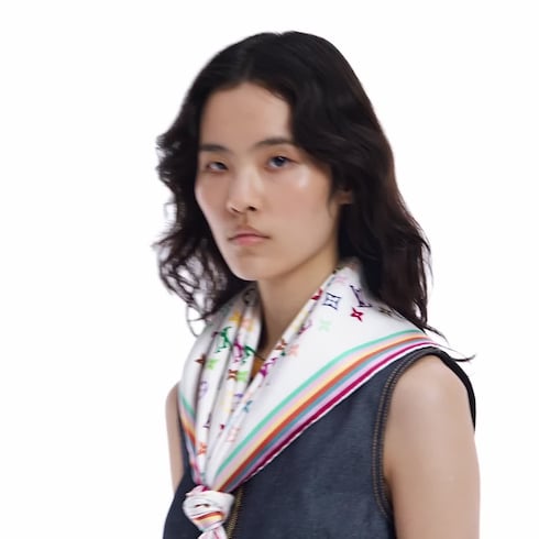 ルイ・ヴィトンと著名な日本人アーティスト 村上隆とのクリエイティブなコラボレーションから誕生した「LV × TM カレ90・モノグラム マルチカラー」。光沢感のあるシルク100%で仕上げた贅沢なアクセサリーに、村上隆が再解釈したメゾンのシグネチャー・パターンをプリントしました。33色の鮮やかな高精細の色彩で描かれたモチーフがシンプルなホワイトの背景を彩ります。コントラストカラーのボーダーがまるでフレームを付けたアート作品のような印象をプラス。