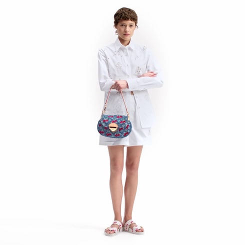 ヴィンテージ風のシルエットがエフォートレスなエレガンスを放つバッグ「LV × TM サンセット」。丸みを帯びたチャンキーなエッジのデザインと、大ぶりのゴールドカラーの差し込み式ロックが調和しています。モノグラム・デニムに、人気の「ルイ・ヴィトン × 村上隆」コレクション第3章ならではの鮮やかなチェリーの刺繍を遊び心たっぷりにあしらいました。スタッズ付きのヌメ革のストラップがエンブレマティックな印象をプラス。
