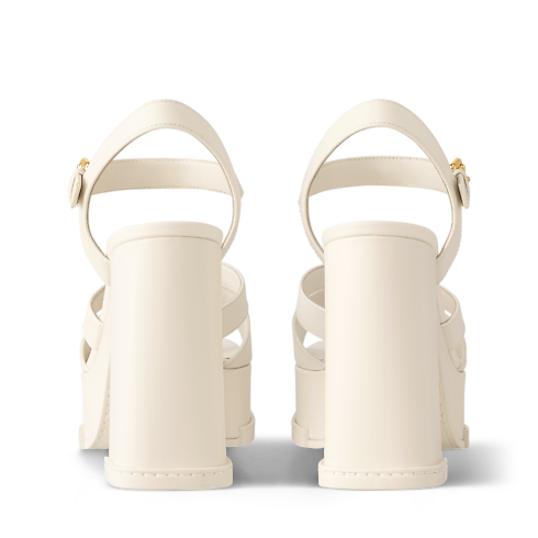 スムースレザーを使用した「マヤ サンダル」。チャンキーヒールとプラットフォームも同素材でカバーし、洗練された印象を演出しました。フロントに配したLV サークルのシグネチャーと、調節可能なアンクルストラップのスクエアバックルといったゴールドカラーのディテールがデザインを引き立てます。快適な履き心地と優れた耐久性を実現するラバーアウトソールで仕上げました。