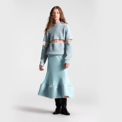 ステートメントを放つミディアム丈のスカート。ランウェイにも登場した幻想的なマーメイドルックを想わせる、遊び心溢れる1着です。ライニングを施したシルクジョーゼットによるシルエットが、腰回りをエレガントに引き立てます。ジャカード仕立ての大ぶりのヘムラインはトップステッチで彩り、構築的かつ彫刻的に仕上げました。背面の務歯見せのハーフファスナーで開閉するデザインです。