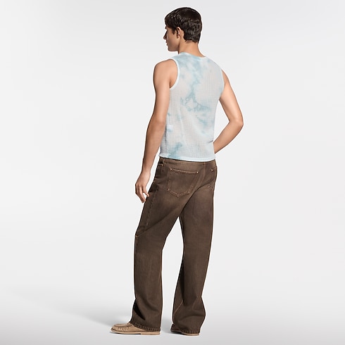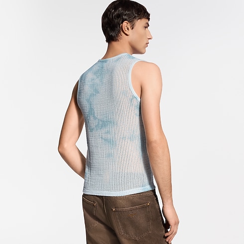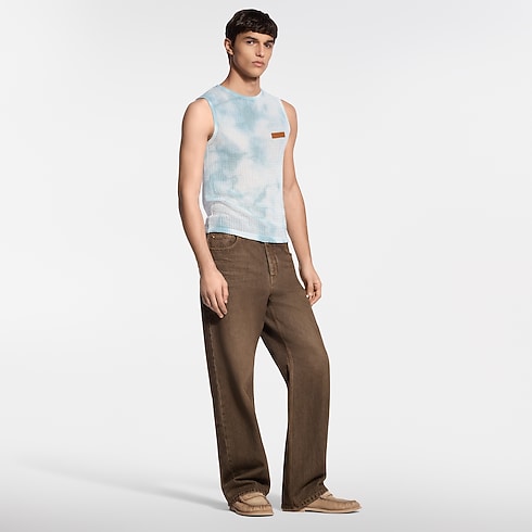 2026春夏ファッションショーのテーマであるインドから着想を得た、淡いブルーのコットンメッシュトップ。斑模様のガーメントダイ(後染め)の技法が太陽で色褪せたような風合いを演出し、1点1点異なる表情を見せます。左胸元には「Louis Vuitton Paris」のレザーパッチをあしらい、アームホールとカラーはリブ編みのトリミングで仕上げました。今シーズンならではの控えめな色合いと質感のあるアイテムとのレイヤードスタイルに活躍する、カジュアルな1着。