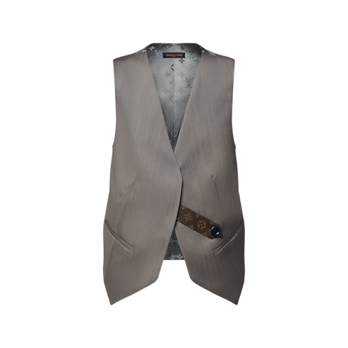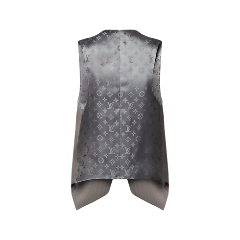 すっきりとしたコンテンポラリーなラインとオーバーサイズのシルエットで、マスキュリンなテーラリングコードを取り入れたウエストコート。前面は上質なウール&シルク混紡素材を、背面はモノグラム・ジャカードをあしらった光沢感のあるシルク&レーヨンでコントラストを演出しています。エレガントなウェルトポケットとモノグラム・キャンバスのタブでモダンな仕上がりに。