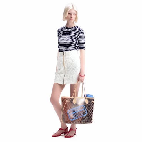 すっきりとしたAラインのシェイプに仕立てたモダンな定番ミニスカート。前面の務歯見せファスナーにはエレガントなレザーフリンジ付きの引き手をあしらいました。今シーズンを象徴する夏らしい同系色のモノグラム・パターンをフィルクーペ織りの技法で施したデニムを使用し、無地のインサートがポケットと背面にコントラストを控えめに描きます。シックなゴールドカラーの金具で仕上げたデザイン。