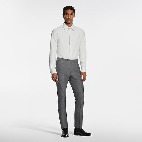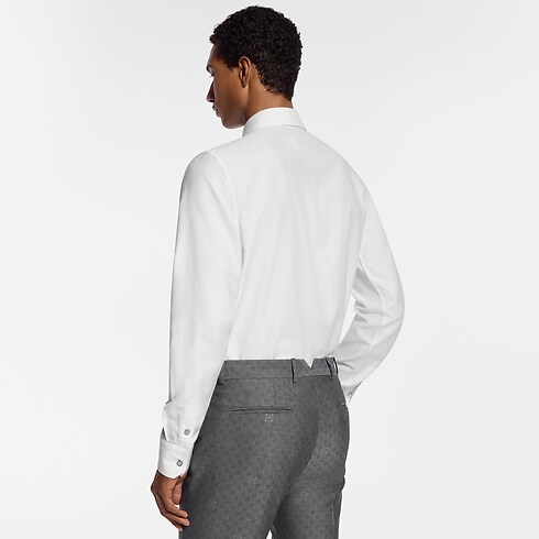 上質なオーガニックコットンで仕立てた、エレガントなホワイトのイブニングシャツ。ミニマルなシルエットで、比翼仕立てのボタンプラケットを備えたミニマルなシルエットで、ジャカード織りで表現された同系色のスペースド・ミニ モノグラム モチーフが洗練された印象を際立たせます。襟はLV ボタンで留めるデザインで、プラケットにはトーン・オン・トーンのシグネチャーラベルをプラス。同モチーフを施したスーツスタイルとのレイヤードを楽しめる、上品な1着です。