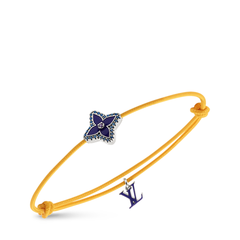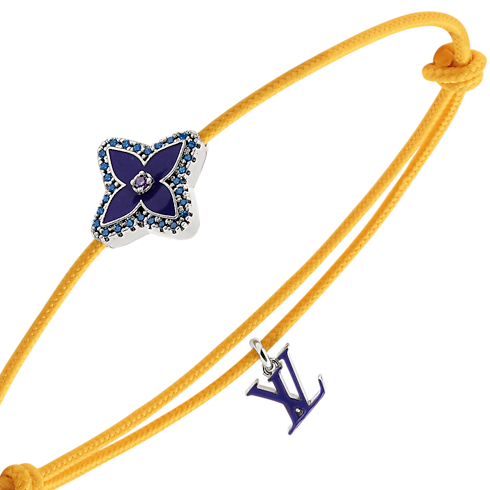 質感と色彩、素材が織りなすコントラストの美しさを讃える「ブレスレット・モノグラム ステシア コルドン」。エナメル加工を施したフラワー・モチーフのビーズをストラスで縁取り、中央にも同系色のストラスをあしらいました。調節可能なノット仕様のコードがその存在感を引き立て、エナメル仕上げのLV イニシャル・チャームがメゾンならではのアクセントをプラス。普段の装いにもコーディネートしやすいアイテムです。