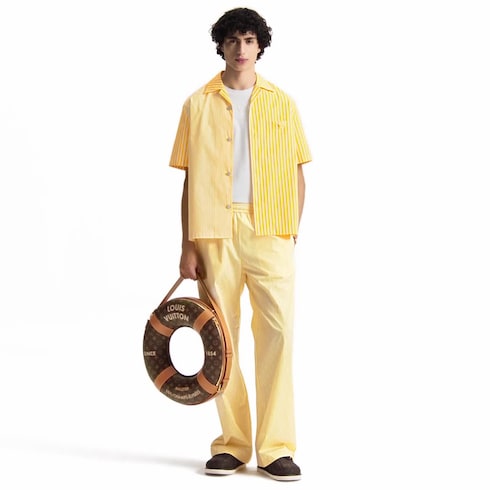 晴れた夏の日にぴったりなショートスリーブシャツ。鮮やかなイエローのストライプをプリントしたモノグラム・ジャカードの生地を使用し、オープンカラーで仕上げました。前面右側にあしらわれた細めのストライプがアイキャッチーなパッチワーク効果を生み出し、LV フラワーのラバーパッチが胸ポケットにアクセントを添えます。同シリーズのドローストリングパンツと合わせれば、爽やかでグラフィカルな印象のセットアップに。