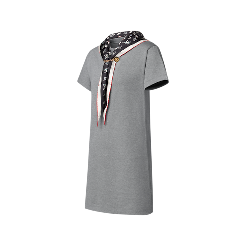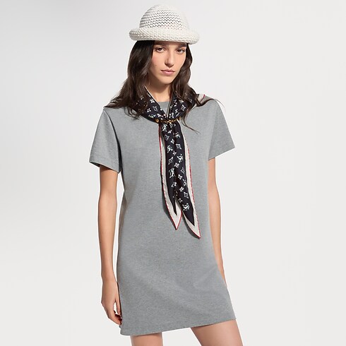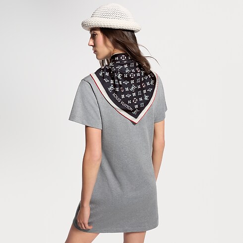 カジュアルなコットンジャージーのTシャツドレス。「ノーティカル」カプセル・コレクションに登場したモノグラム・ブイ モチーフの全面プリントと、大きめの「Louis Vuitton」シグネチャーを配した取外し可能なシルクマフラーにより、エレガントに昇華されています。ネックラインにはモノグラム・フラワーのボタンが付いたメタルチェーンのディテールをあしらい、メゾンならではのタッチを添えました。