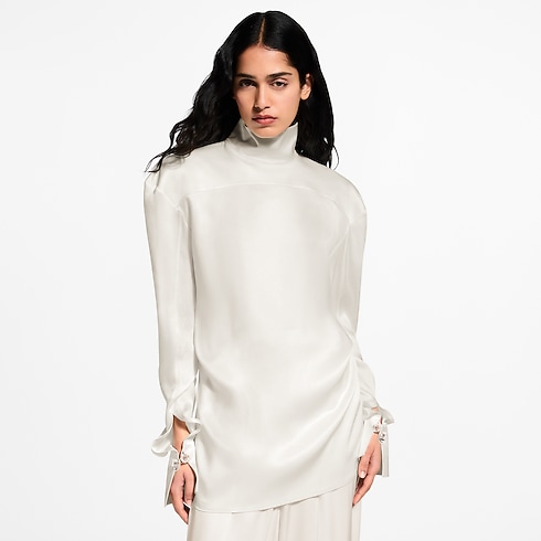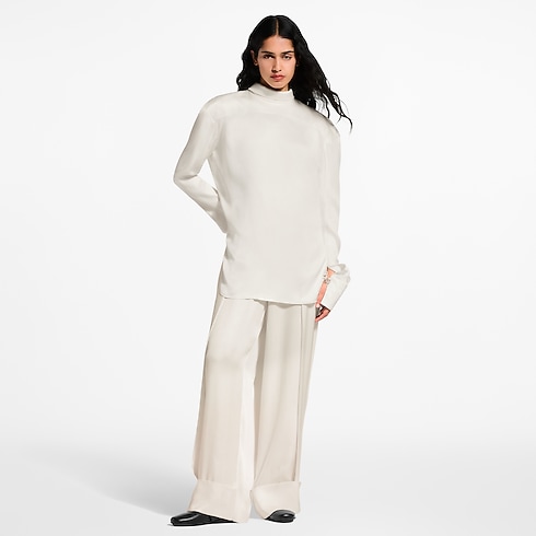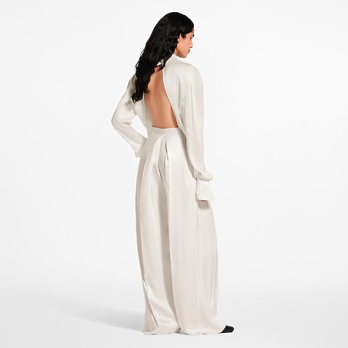 グラフィカルなラインによりステートメントアイテムに昇華した、ランウェイコレクションのブラウス。優美なシルクツイルで仕立てたシャープなストレートカットに印象的なショルダーとハイネックのカラーを配し、バックにはショルダーのラインに沿って大胆なカットアウトを施し、背中全体が露出するスタイルに仕上げました。モノグラム・フラワーのカフリンクスが、エレガントなシグネチャーアクセントとしてルックを完成させます。