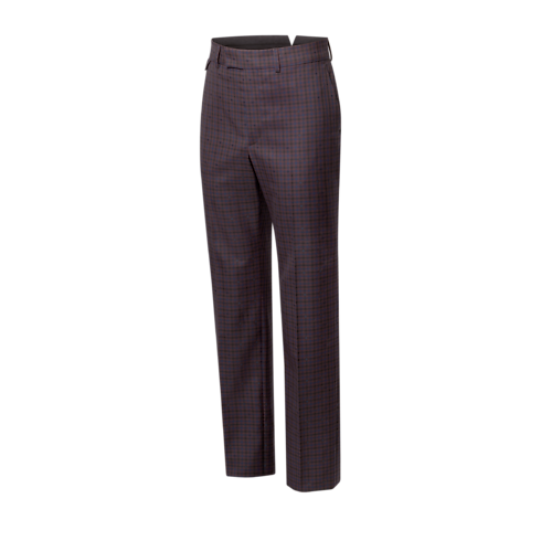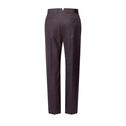 ウールで仕立てたエレガントなテーラードパンツ。チェックのモノグラム・ヴィシー ジャカードを暖かみのあるバーガンディで施しました。LV イニシャルを刺繍した三角形のタブが右腰にアクセントを添え、ウエストバンドの背面には「Marque L. Vuitton Déposée」のラベルをあしらっています。柔らかな構造のシングルブレストのジャケットを合わせれば、デイタイムにふさわしいコンテンポラリーなスーツに。
