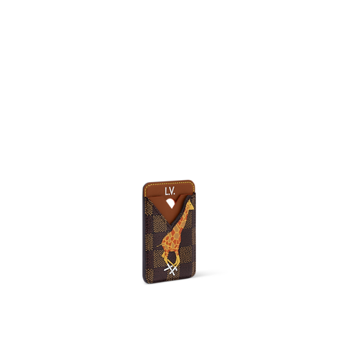 ダミエ・ヘリテージ キャンバスと明るいブラウンのレザーを使用した「LV × ザ・ダージリン リミテッド ポルト カルト・マグネット」。メゾンが同映画『ダージリン急行』を讃えて発表した、疾走するキリンのプリントがあしらわれています。MagSafe対応のiPhoneに簡単に装着でき、2つの「V」シェイプのカードスロットを備えたデザイン。
