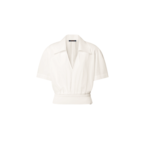 カジュアルなパジャマスタイルから着想を得たブラウス。張りと快適な着心地を兼ね備えたアイテムです。エアリーなコットンポプリンを使用し、ショートスリーブのシェイプに鋭いVネックラインとポインテッドカラーをあしらいました。リブ編みで引き締めたクロップドウエストが美しいシルエットを演出。レザーのLV サークルタブがさりげなくシグネチャーを添えています。
