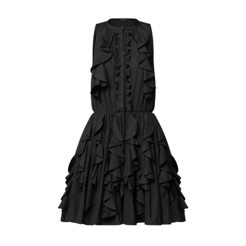 軽やかなコットンポプリンのリトルブラックドレス。胸元とボリュームのあるスカート周りに繊細なフリルをあしらい、エアリーでモダンな雰囲気に仕上げました。フロントのボタン上部にはリボンタイがロマンティックなタッチを添え、絞ったウエストラインがシルエットにメリハリを与えます。サイドには隠しファスナーも。