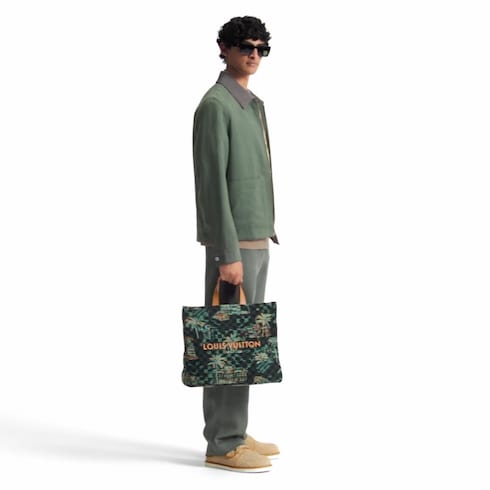 マイアミのヴィンテージのポストカードから着想を得たモチーフが特徴的な、ジャカードコットンの「ショッパー・トート MM」。同都市の活気溢れるナイトライフを表現したパターンには、マリーナブルーの背景にパームツリーや象徴的な建物、クラシックカーなどのマイアミのシンボルが描かれています。ファレル・ウィリアムスが手掛けたアイコニックな「Marque L. Vuitton Déposée」シグネチャーを贅沢な装飾にさりげなく取入れました。