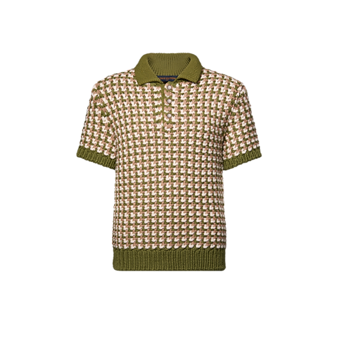 クラシックなポロシャツを着想源に、2026春夏ファッションショーのランウェイで披露された一品。ボリューム感のあるウールニットで仕上げ、エレガントなグリーンとベージュでグラフィカルなLVステッチのモチーフを表現し、背面にはレザーのシグネチャーパッチを配しました。レイヤードアイテムとしてシャツの上に重ねることで、洗練された色彩とテクスチャーを楽しめます。