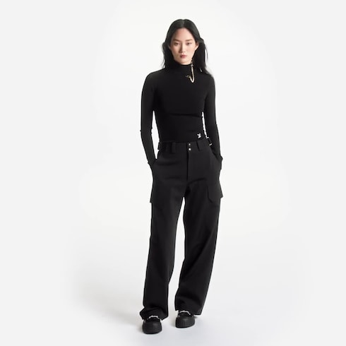 ワードローブの定番アイテムにひねりをプラスした、ステートメントを放つタートルネックセーター。ゴールドカラーの務歯見せのファスナーをアシンメトリーにあしらい、引き手には襟元をエレガントに飾るチェーンを添えました。ストレッチの効いたシルキーなニットで仕立てた、第二の皮膚のような着心地の良さが魅力です。コントラストを描くLV イニシャルがスタイルを完成させます。