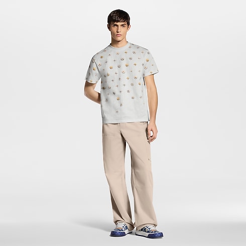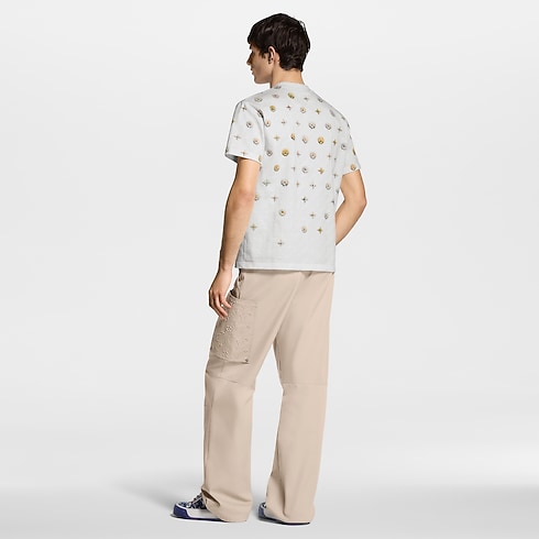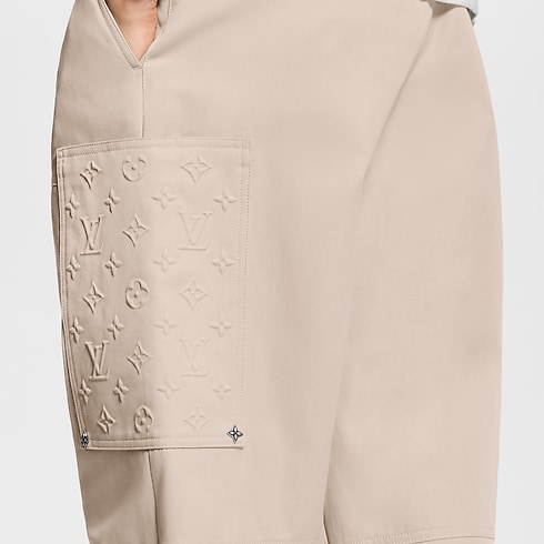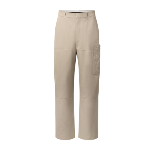 本コレクションのリラックス感がありながらもエレガントなムードを表現する、ベージュのカーペンターパンツ。柔らかなコットンツイルで仕立て、モノグラム・フラワーのリベットでモノグラムをエンボス加工で施した左脚のパッチポケットを彩りました。ワークウェアから着想を得たシルエットに配した膝部分のダーツが動きやすさを高めます。揃いのオーバーシャツと合わせれば、季節の変わり目に活躍するエフォートレスでシックなルックに。