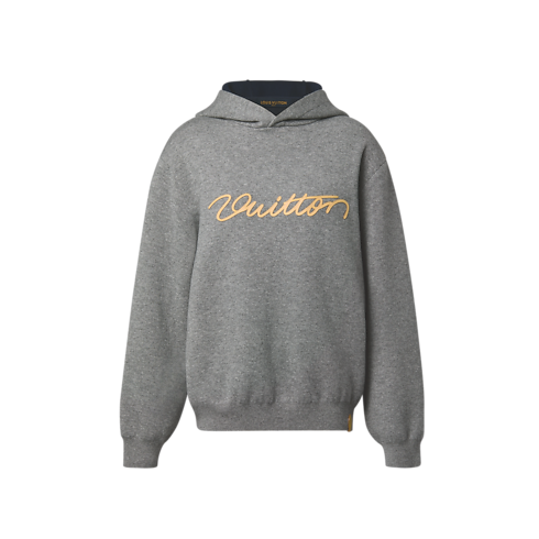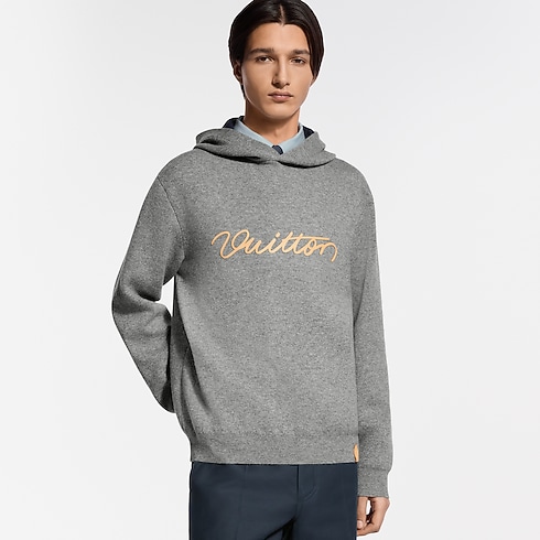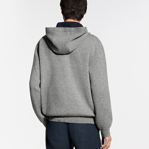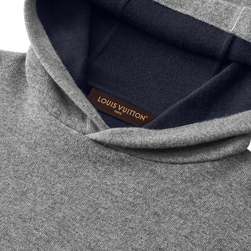 快適さとスタイルを兼ね備えたヘザーグレーのフーディ。内側に温かみのあるウール、外側に上質なカシミヤを配して精緻に編み上げたダブルフェイスのジャージーで仕立てました。手書き風に仕上げたヌメ革の「Vuitton」シグネチャーがメゾンのレザーグッズの伝統を彷彿させ、胸元にグラフィカルなアクセントを添えます。