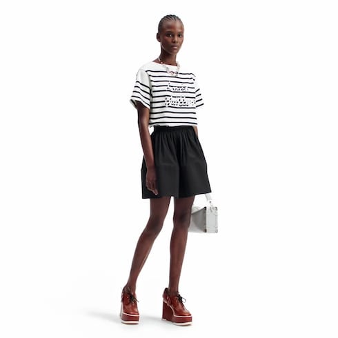 柔らかなコットン混紡のストライプニットで仕上げたモダンなマリンスタイルのTシャツ。毎日のスタイリングを引き立てる、ボートネックを配したカジュアルなストレートシェイプの1着です。反転させたストライプで施した手描き風の「Louis Vuitton」プリントが胸元に遊び心あるシグネチャーをプラス。