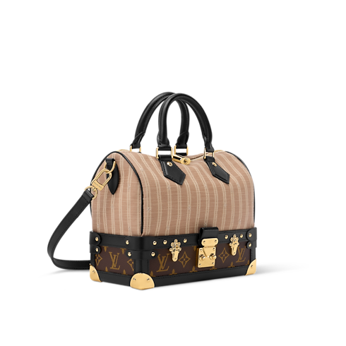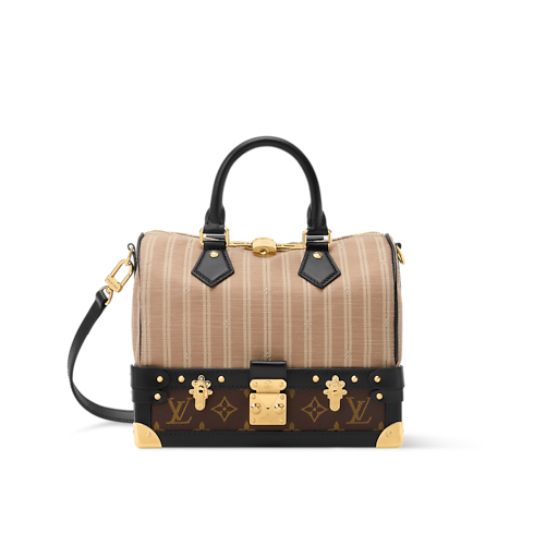 「アウト オブ ザ トランク」コレクションから、過去数十年にわたり受け継がれてきたルイ・ヴィトンのラゲージにオマージュを捧げたユニークなデザインの「スピーディ・バンドリエール 22」が登場。メゾンを象徴するモノグラム・キャンバスが、ストライプの入ったベージュの生地やスムースレザーのトリミングと美しいコントラストを描き出します。パドロック(錠前)やトランクのコーナー部分、Sロックスタイルの留め具など、メゾンならではのゴールドカラーのシグネチャーで彩った、ヴィンテージ感のある一品です。