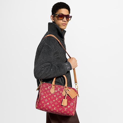 シルクスクリーンプリントの技法を用いてゴールドカラーのモノグラム・パターンをあしらった、極めてしなやかなカーフレザーの「スピーディ P9 バンドリエール 30」。ヌメ革を使用したトップハンドルやネームタグ、キーベルでアクセントを添え、洗練された印象に仕上げています。ラムレザーのライニングを施した内装には、3つのフラットポケットやファスナー式ポケットをプラス。同系色の取外し可能なポーチが、このエレガントな逸品を完成させます。