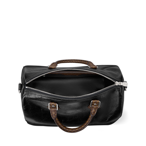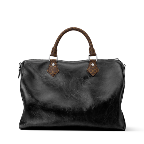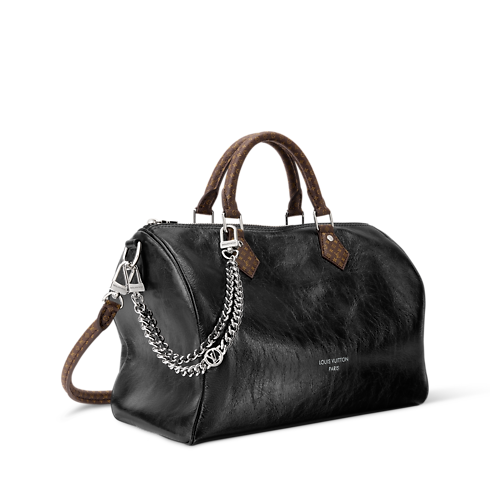 ロックンロール風のクールなスタイルに仕上げることで、アイコニックなデザインをファッションステートメントへと昇華させた、軽さも魅力の「スピーディ・ソフト 30」。クリンクル加工を施した光沢感のあるレザーに、ミニ・モノグラム キャンバスのトリミングでアクセントをプラス。都会のライフスタイルに最適で、多彩なアレンジを楽しめるLV サークルをあしらった個性的なダブルチェーンが彩りを添えます。ノートパソコンをはじめとする普段の必需品がすっきりと収まるサイズも魅力。
