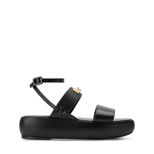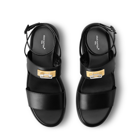 2026春夏ファッションショーに登場した、しなやかなラムレザーの「スウィング ロック サンダル」。アッパーに配した、ルイ・ヴィトン トランクのメタルハンドルを想起させる印象的なゴールドカラーのアクセサリーにちなんで名付けられています。大胆でありながらも履き心地のよい1足は、足首を包み込むように留めるデザインや幅の異なるストラップ、快適なフラットフォームのアウトソールが特徴です。