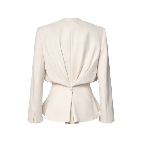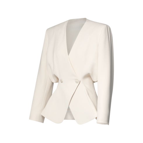 ランウェイに登場した、ダブルブレストスタイルのジャケット。ローブの洗練された佇まいから着想を得た輪郭の美しいシルエットが、エレガントな存在感を放ちます。張りのあるシルクの混紡素材を使用し、構築的に仕立てたパッド入りのショルダーと、背面をほどよくフィットさせたボリューム感のあるボディが、ロマンティックなドレープを演出。流れるようなヘムラインがデザインを引き立てます。