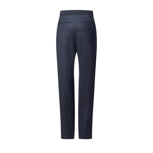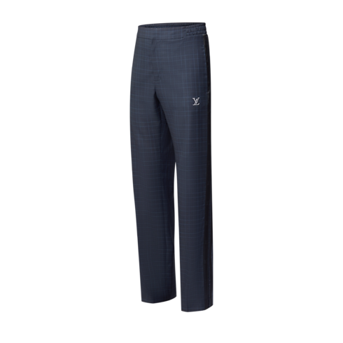 スポーティな魅力でメンズ・フォーマルウェアのコードにひねりを加えたテーラードトラックパンツ。タイムレスなネイビーブルーのグレンチェックの上質なウールで仕立て、ストラスで装飾したLV シグネチャーと両脚のサイドにLV ロゴ入りのグログランバンドをあしらいました。揃いのトラックトップを合わせればエレガントでモダンなセットアップが完成します。