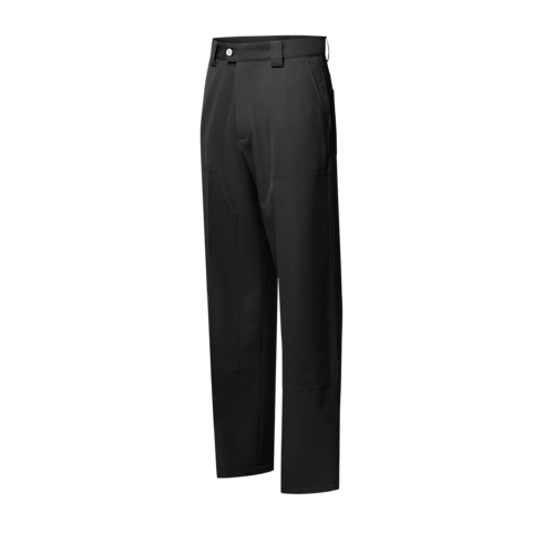 ワークウェアの定番をエレガントにアレンジし、スマートでカジュアルなスタイルを完成させるブラックのカーペンターパンツ。ダブルニーのレギュラーシルエットを、テーラリング素材である上質なウ―ルツイルで仕立てました。バックポケットは光沢感のあるトーン・オン・トーンの糸で施したLV ブラゾンの刺繍で彩り、パール調のボタンがシックなアクセントを添えます。