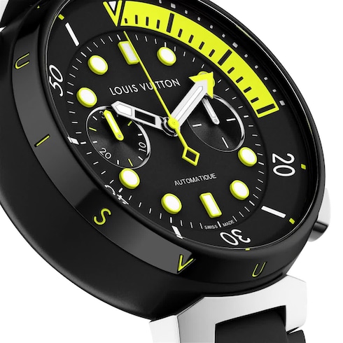 「タンブール ストリート ダイバー」に必要不可欠なコンプリケーション機能を搭載した「タンブール ストリート ダイバー クロノグラフ」。実用性と視認性を追求するメゾンの姿勢の結晶であるクロノグラフ機能が、大胆なエスプリをプラス。ネオンイエローとブラックのクロノグラフが特徴のウォッチを、完璧に均整の取れた「タンブール」のケース、コントラスト鮮やかなフィニシング、発光性のインデックスといったディテールで仕上げました。あらゆるシルエットにスポーティかつ大胆な魅力をもたらす精緻なタイムピースです。