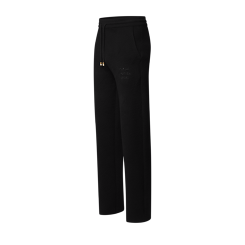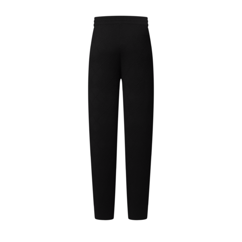 ウール混紡のブラックニットを使用したパンツ。立体感を演出する、キルティング加工したモノクロームのニットで表現したコレクションのダミエ・アーガイル モチーフを全面にあしらい、カジュアルなシルエットにスマートなひねりを加えました。左脚には「Marque L.Vuitton Deposée」シグネチャーが刺繍され、快適さを叶えるウエストのドローストリングにはパール調のコードエンドが彩りを添えます。同シリーズのボンバージャケットと合わせれば、寛ぎのひと時にぴったりのエレガントなセットアップに。