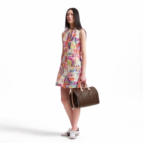 「フライト・モード」カプセル・コレクションに登場したプレイフルなステートメントを放つドレス。メゾンの伝統にオマージュを捧げる、「Louis Vuitton」シグネチャーのカラフルなトラベルパッチを全面にいきいきとプリントしました。構築的なコットンギャバジンをフィット感のある上半身とAラインスカートのシックなシルエットに仕立て、務歯見せのファスナーで開閉するデザイン。