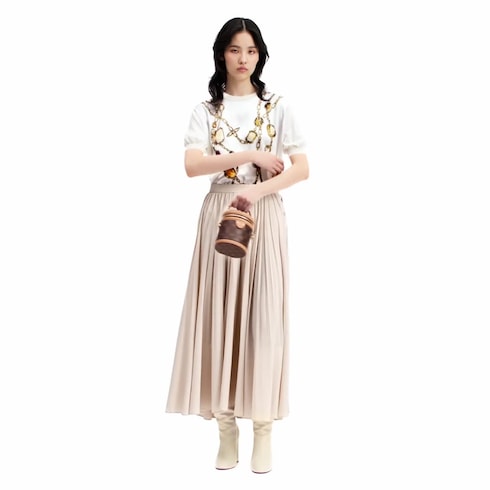 本コレクションを象徴するネックレス・モチーフを、今シーズンらしい深みのある色合いでネックラインに沿ってあしらったニットトップ。遊び心溢れるトロンプ・ルイユ(騙し絵)風プリントが目を引くアイテムです。上質なウールニットで仕立てた定番のTシャツのフォルムにすっきりとしたリブ編みのヘムを配し、毎日の装いを彩る1着。