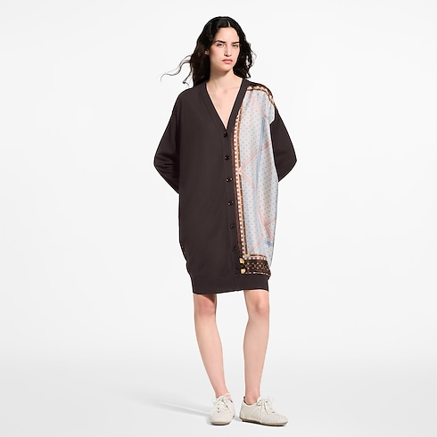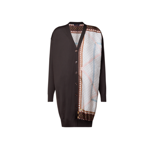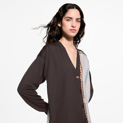 メゾンの旅の伝統を控えめに讃えるカーディガン。左側を際立たせるエレガントなシルクのインサートには、ルイ・ヴィトン トランクのアーカイヴの内装をモチーフにしたプリントを施しました。長めのルーズフィットに仕立てた着心地のよいウールニットは、Vネックラインで留められます。
