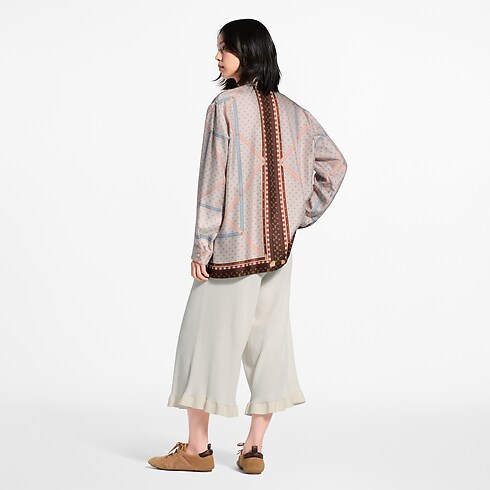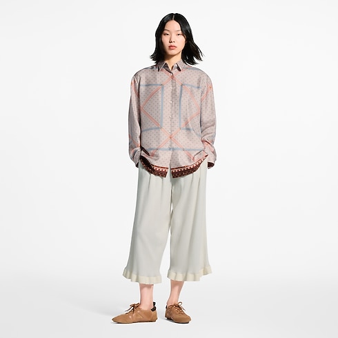 ルイ・ヴィトンの旅の伝統を讃え、アーカイヴに残るメゾンのトランクの内装を全面にプリントした、グラフィカルな存在感を放つシャツ。柔らかく軽やかなシルクツイルを使用し、流れるようなストレートシルエットに仕立てることで、エフォートレスかつエレガンスなスタイルに仕上げました。スマートな襟とボタン付きの袖口が、タイムレスなテーラリングコードを完成させます。