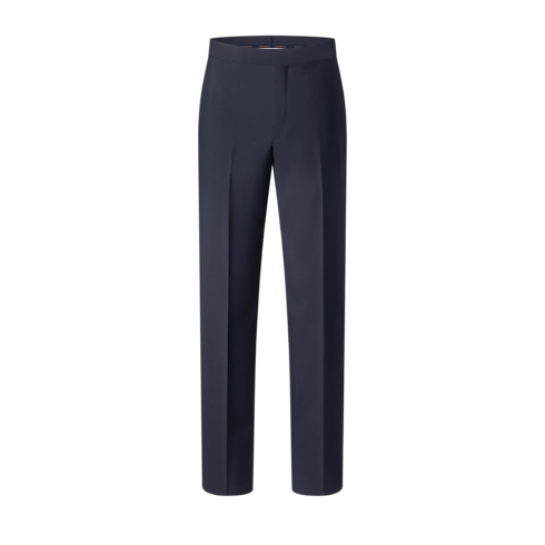ボディラインを美しく引き立てる、シャープなシガレットフィットに仕立てたタキシードパンツ。エレガントなネイビーブルーに仕上げたマットな質感のウールを使用し、両脚の外側にはブラックサテンのバンドを、バックポケットにはサテンのパイピングを施しました。織り上げたLV ラベルがウエストの背面をさりげなく彩ります。同シリーズのダブルブレストスタイルのジャケットと合わせれば、イブニングシーンにふさわしいタイムレスな気品溢れるセットアップに。