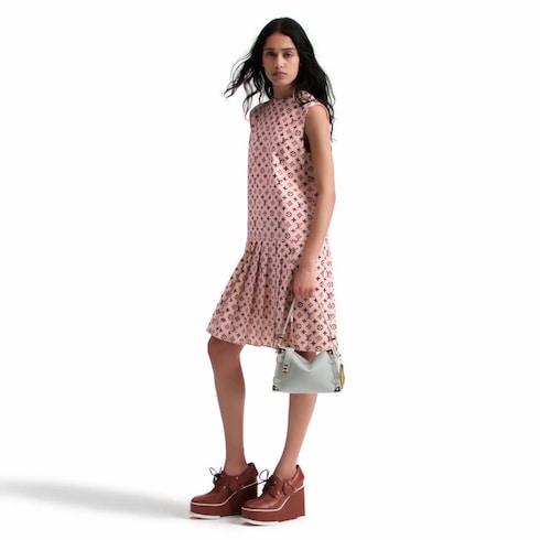 グラフィカルなウォッシュ加工のモノグラム・モチーフを全面にあしらったドレス。今シーズンならではの柔らかな色合いの、皺になりにくいシルクデシン(ちりめん)で仕立てました。すっきりとしたラインのストレートフィットのボディに、ボクシープリーツをあしらったスカートがロマンティックなボリューム感をもたらします。背面には務歯見せのハーフファスナーをプラス。