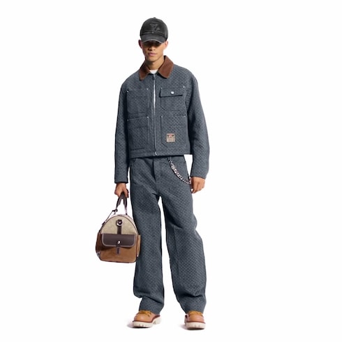 2025秋冬ファッションショーに登場したジャカード織りのダンディ・モノグラム モチーフをダークグレーのオーガニックコットンにあしらったワークウェアパンツ。わずかなデボス加工入りの質感のある生地を使用し、デニムポケットとニーパッチを配したリラックスフィットに仕立て、パール風ボタンがダンディかつ洗練された印象を添えます。揃いのジャケットと合わせればカジュアルでありながらも個性的なセットアップに。